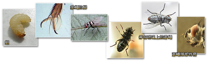 蒼蠅通常指雙翅目環裂亞目的昆蟲,蠅類體型一般為小型或中型,體積比蚊子大了許多,故飛行顯而易見。複眼發達,口器一般為舔吮式,少數為刺吸式,胸部三節癒合,以中胸最為發達。台灣蠅類約有 200 多種,其卵為白色,幼蟲三齡,通常由卵至成蠅需 12 天,成蠅壽命約 2-4 週。可於垃圾堆、動物糞便、屍體、腐敗的水果上見到牠們的蹤跡,也是害環境衛生重大害蟲之一。大部分的品種都有吸吮口器並進食流質食物,有些品種吸血,例 如螫蠅、馬蠅。蒼蠅傳播的疾病,包括腸道炎、痢疾、傷寒、霍亂等。